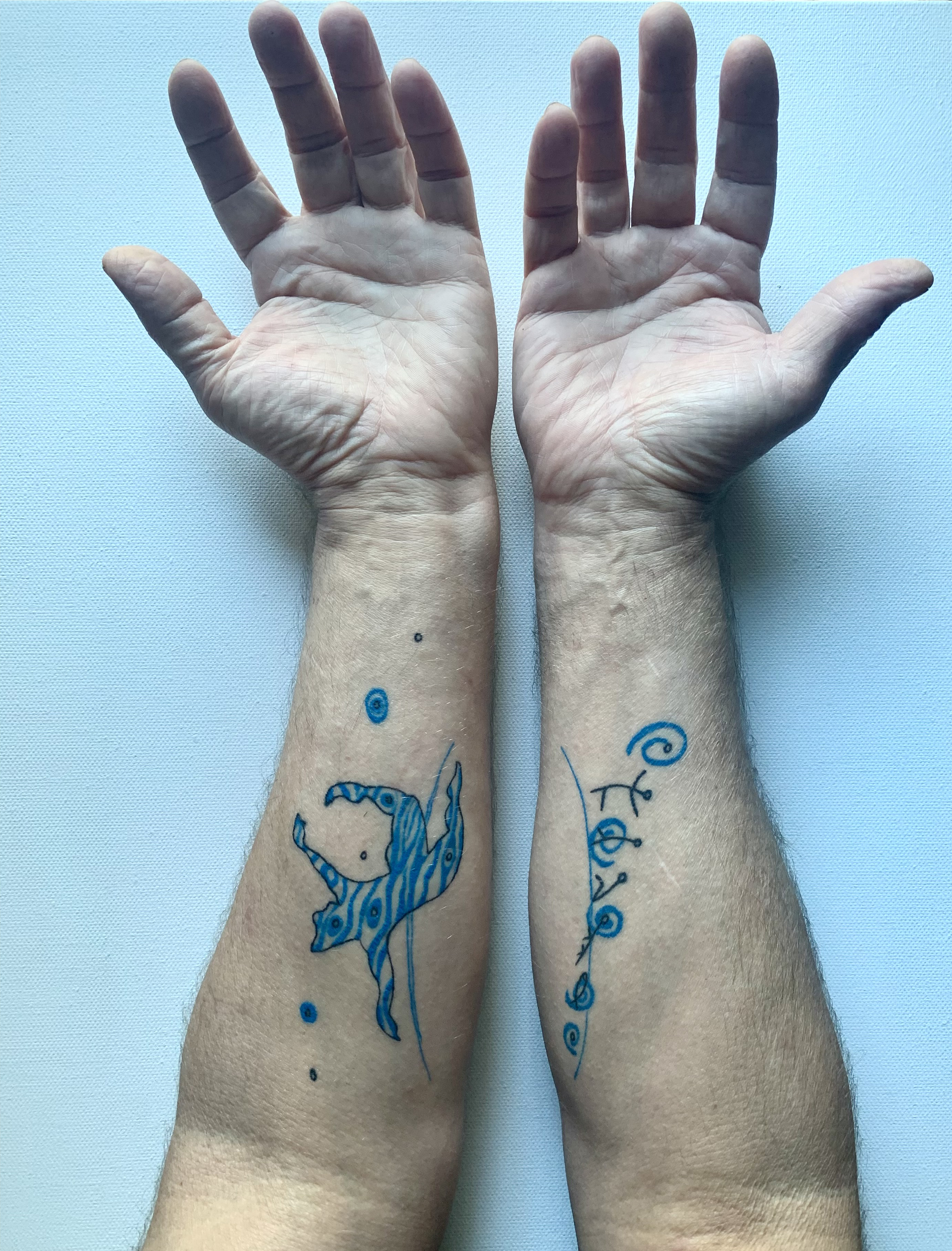 Ma proximité avec les cultures des Premières Nations depuis plus de 30 ans, m'ouvre à m'enraciner dans une ascendance ancestrale sage et bienveillante. Par le biais d'une révélation chamanique en 2006, l'esprit du Clan de l'Ours, venu des abysses du cosmos indigo (bras gauche), ancre mon expression identitaire dans l'immensité de la pérennité.